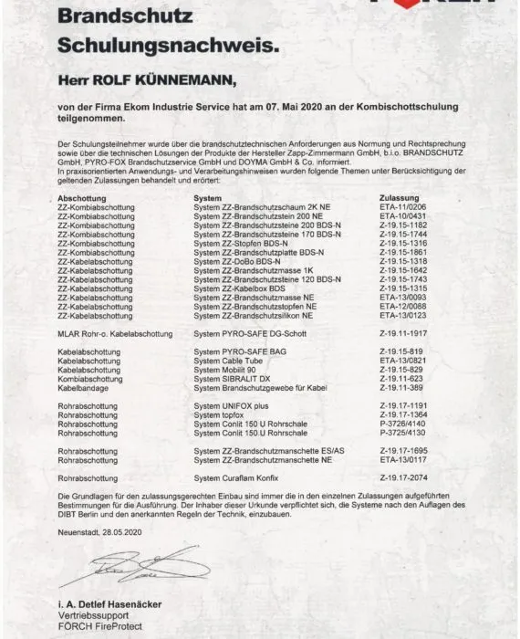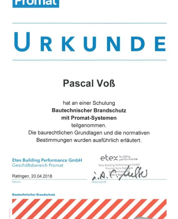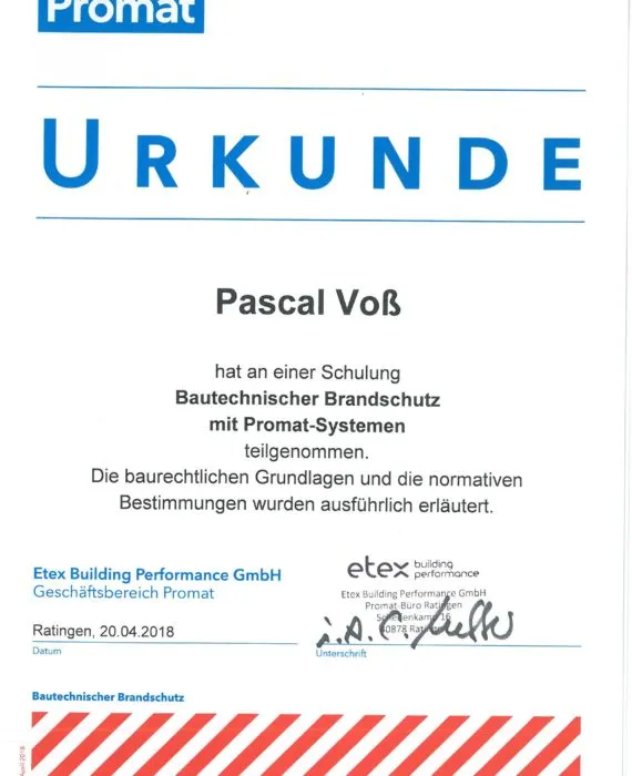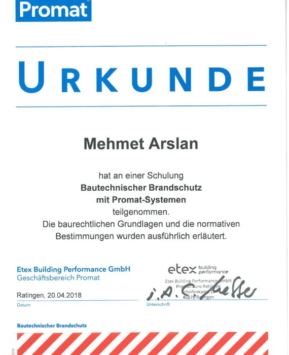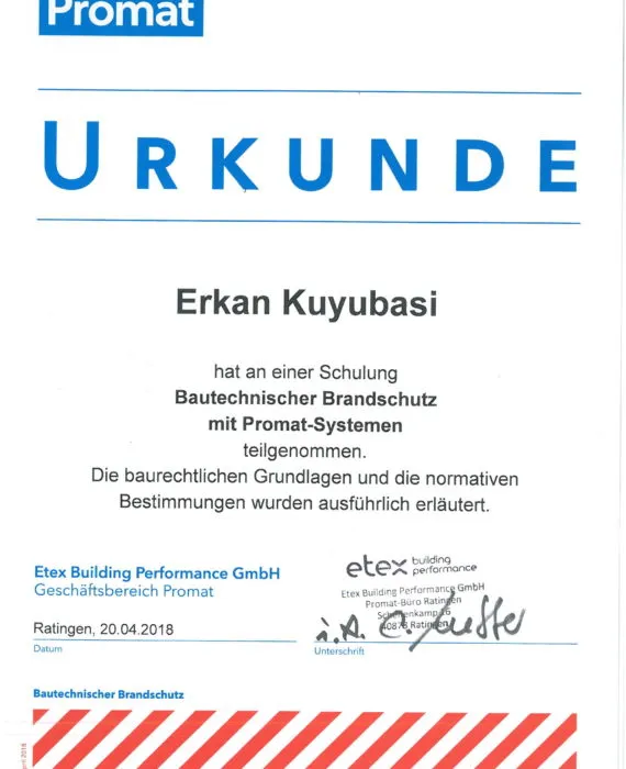 Urkunde zum Bautechnischer Brandschutz mit Promat-Systemen