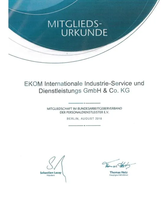 Mitgliedschaftsurkunde im Bundesverband der Personaldienstleister e.V.