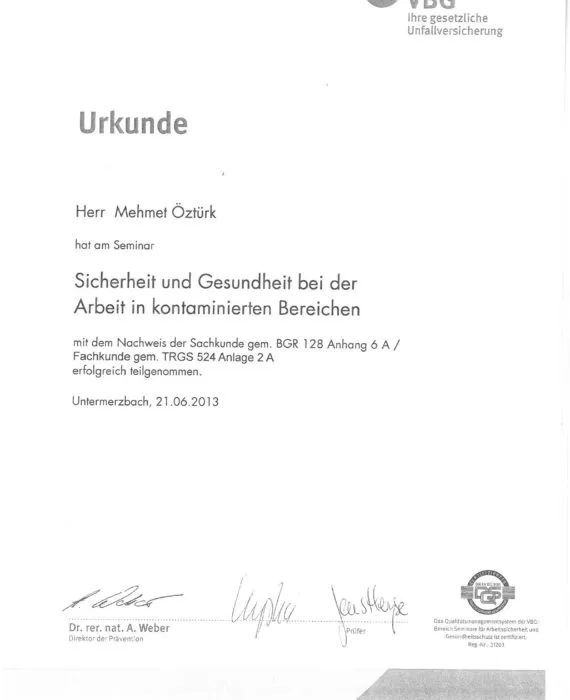 Urkunde zum Sicherheit Gesundheit bei der Arbeit kontaminierten Bereichen