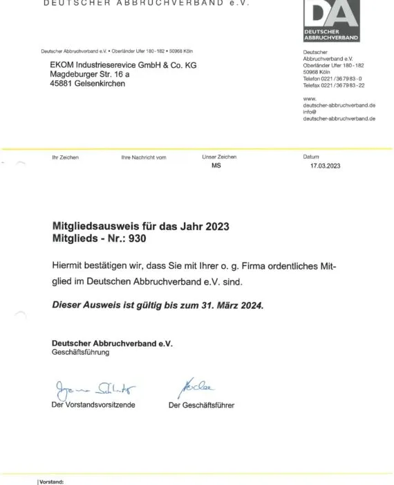 Mitgliedsbescheinigung für das Jahr 2023 Deutscher Abbruchvereinband e.V.