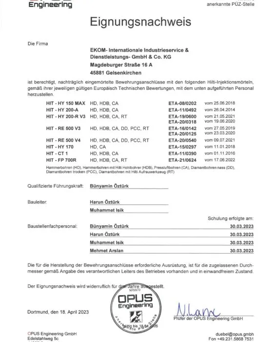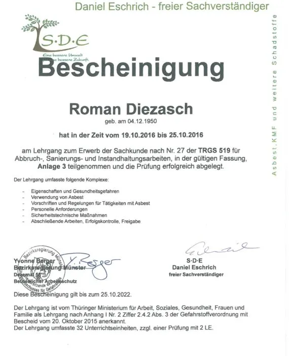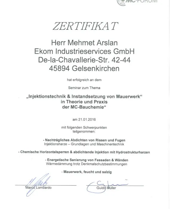 Zertifikat Seminar zum Injektionstechnik Instandsetzung von Mauwerk