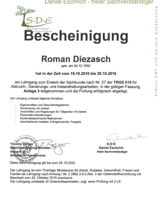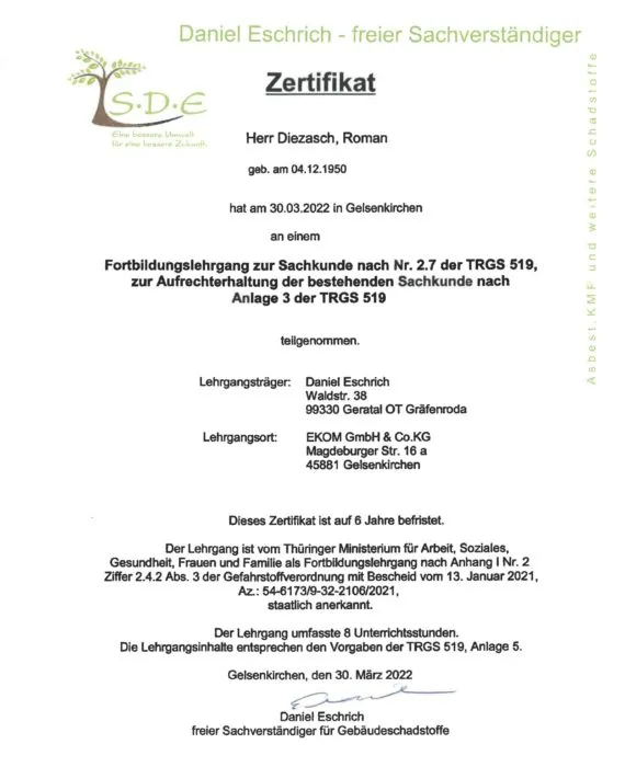 Zertifikat zu den Fortbildungslehrgang zur Sachkunde